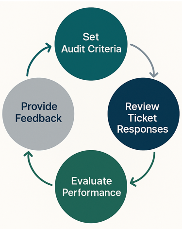 ClarityCX conducts regular quality audits and performance reviews to follow a structured, continuous cycle starting with clear criteria, reviewing real support interactions, evaluating team performance, and closing the loop with actionable feedback. This process ensures your support team stays aligned, consistent, and continuously improving.